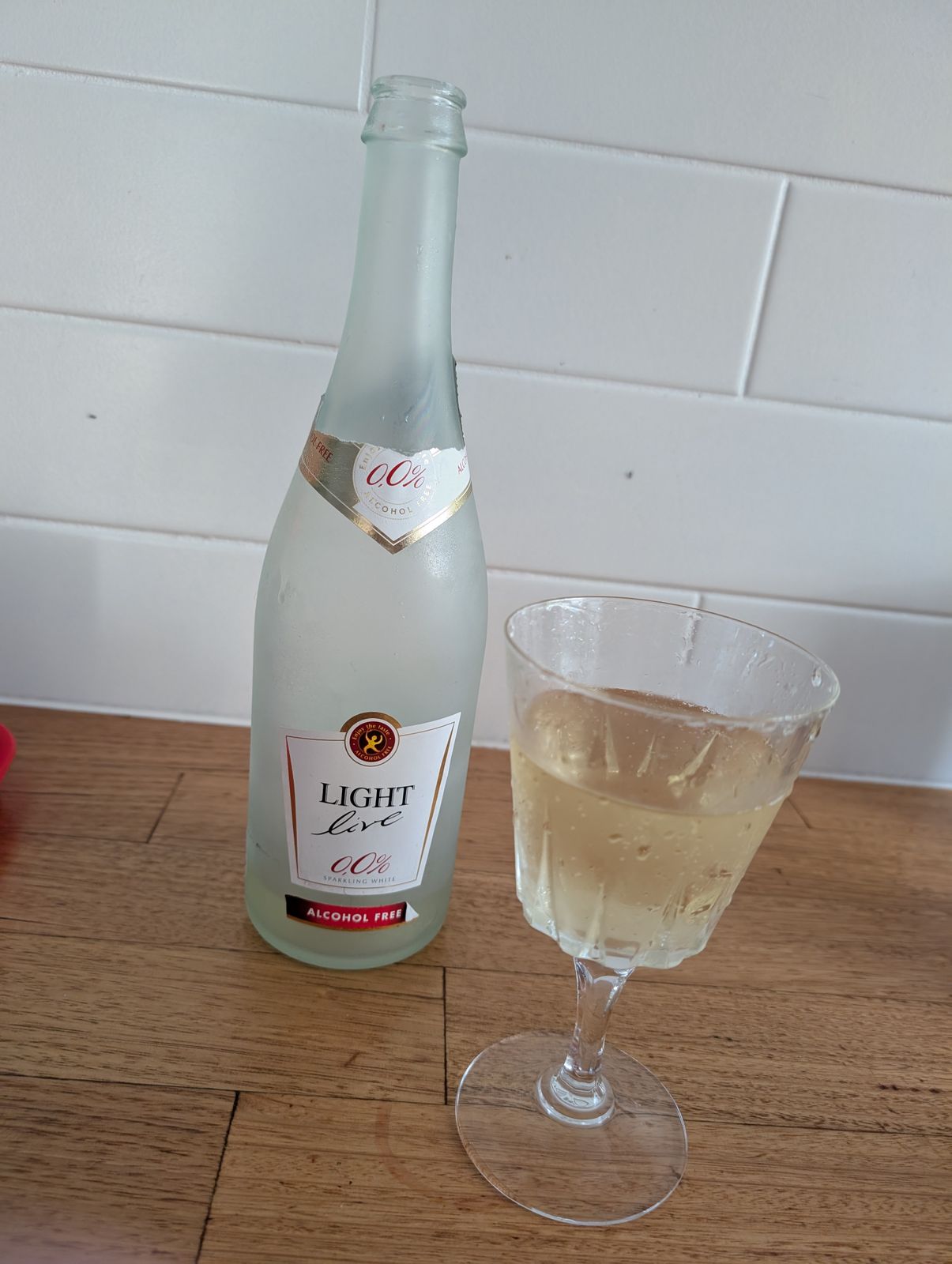 Pour non-alc sparkling white wine, white grape juice, and lime juice in a wine glass over ice. Garnish with fresh berries and lemon twist. Elegant and refreshing, perfect for celebrations.